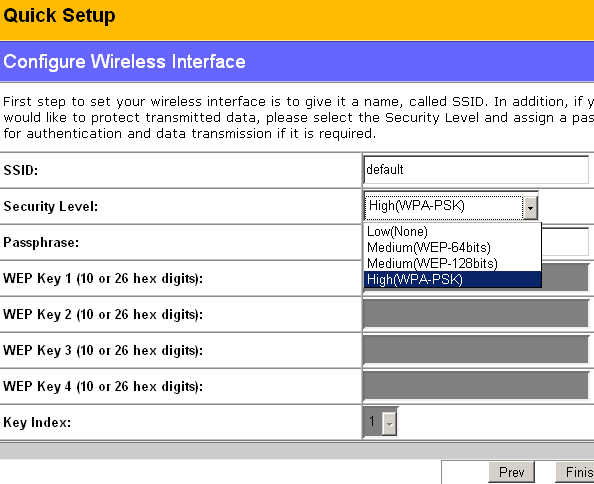 Тут нам предлагается задать SSID (название) беспроводной сети, а так же выбрать тип и ключи шифрования беспроводного трафика.
