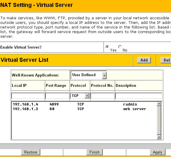 Раздел Nat Settings -> Virtual Server позволяет "виртуальные сервера", то есть сделать сервисы, находящихся на машинах внутри локальной сети, доступными из Интернет. На скриншоте показаны два таких сервера — WEB, находящийся на машине с адресом 192.168.1.3 и radmin (удаленное управление windows-компьютером), висящим на машине 192.168.1.4.
