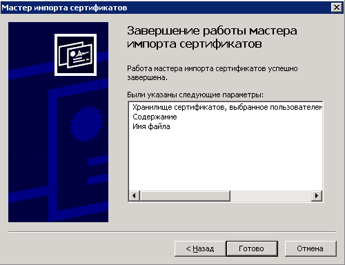 После нажатия на "Далее" система сообщает об успешной установке компьютерного сертификата.