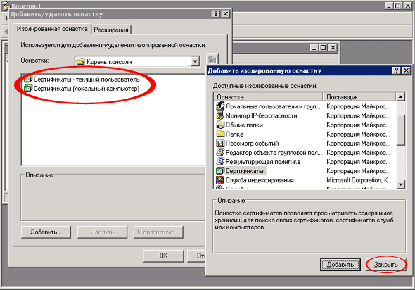 В результате мы добавили две оснастки — для управления сертификатами пользователя и компьютера.