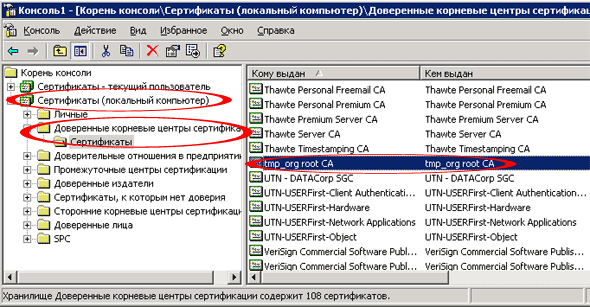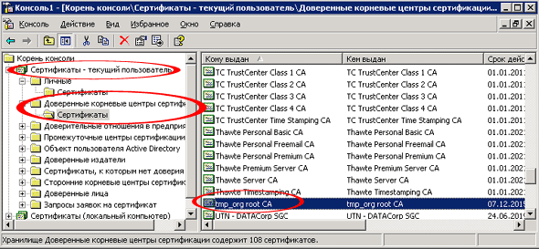 Раскрываем "Доверенные корневые центры сертификации". В появившемся списке у нас отсутствует сертификат нашего CA-центра "tmp_org root CA".