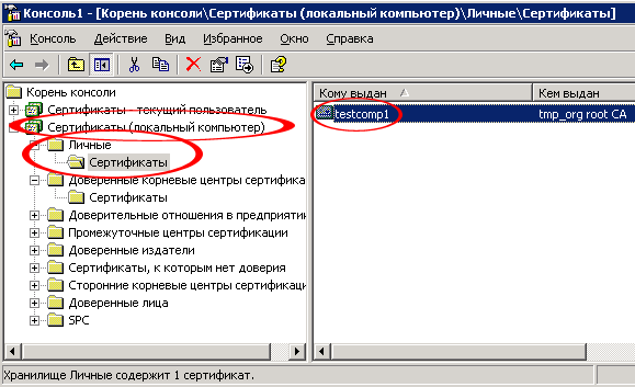 CN поле сертификата соответствует "testcomp1". Компьютер тоже называется "testcomp1".