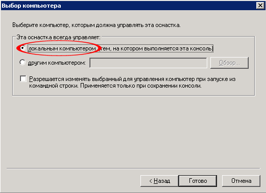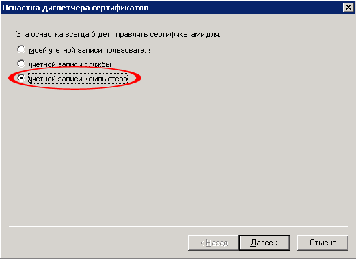 При добавлении оснастки управления сертификатами компьютера, появляется меню, где можно указать, каким именно компьютером мы хотим в данный момент управлять — выбираем "локальным компьютером" (в принципе, администратор домена может удаленно управлять оснастками и на удаленных машинах).