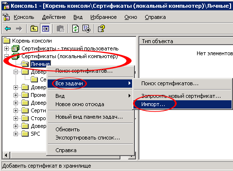 Щелкаем на пункт "Личные" в оснастке сертификатов локального компьютера, выбираем "Все задачи" и жмем на "Импорт".
