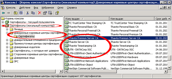 Теперь переходим на оснастку управления сертификатами для локального компьютера: