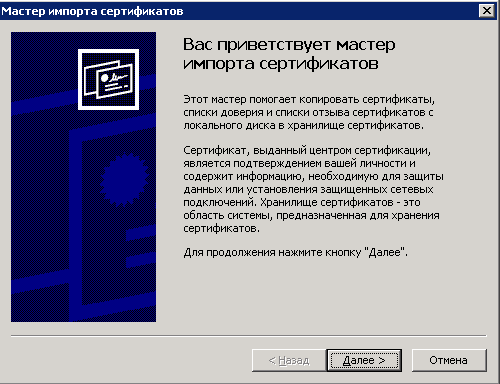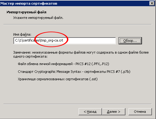 Выбираем .crt файл, содержащий корневой (самоподписанный) сертификат нашего сертификационного центра, и жмем кнопку "Далее".