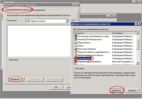 В появившемся списке выбираем оснастку "Сертификаты" и жмем кнопку "Добавить".