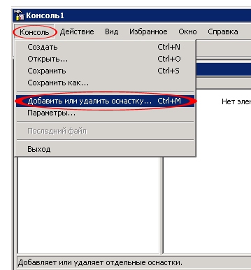 Для этого идем в меню "Консоль". И выбираем пункт "Добавить или удалить оснастку".