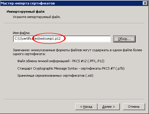 Выбираем сертификат компьютера (testcomp1.p12) и жмем "Далее".
