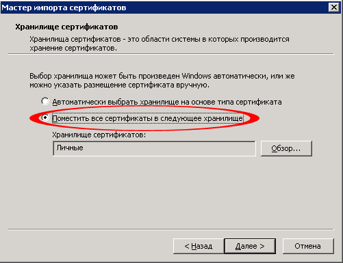 Система сама разберется, куда помещать сертификат. Но можно и указать, что помещать сертификат необходимо в личное хранилище.