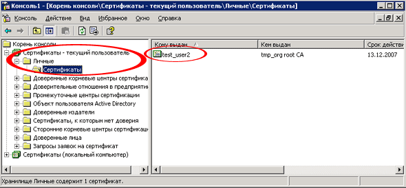 Если в предыдущей статье мы уже добавляли пользовательский сертификат test_user2, то мы увидим его здесь. Если еще не добавляли, то его следует добавить аналогично нижеописанному для сертификата компьютера (правой кнопкой на "сертификаты" -> "Все задачи" -> "Импорт").