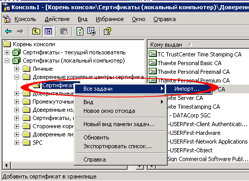 Аналогично с корневым сертификатом центра CA — в предыдущей статье мы уже добавляли его, поэтому он уже есть в списке доверенных сертификатов. А если сертификат еще не был добавлен, действуем по аналогии с добавлением корневого CA для машинного аккаунта ( это будет описано ниже: правой кнопкой на "сертификаты" -> "Все задачи" -> "Импорт").