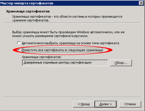 Мастер предлагает выбрать, куда помещать сертификат — выбираем "Поместить в доверенные корневые центры сертификации". И жмем кнопку "Далее".