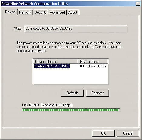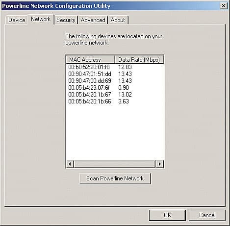Устройствам HomePlug, подобно обычной сетевой карте, в процессе изготовления присваивается индивидуальный 12-значный MAC-адрес, что позволяет им при работе в сети однозначно идентифицировать друг друга, а пользователю с помощью конфигурационной утилиты понять, с какой скоростью общаются между собой устройства (рис. 8, 9).