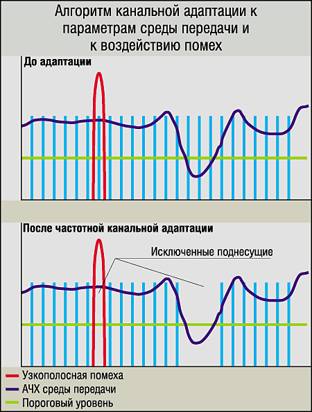 Напомним, что из большого разнообразия вариантов схем модуляции членами альянса, образованного 3Com, Cisco Systems, Hewlett-Packard, Intel, AMD и др., еще в 2000 г. была выбрана схема OFDM (Orthogonal Frequency Division Multiplexing) на основе мультиплексирования с ортогональным разделением частот, предложенная малоизвестной на тот момент компанией Intellon.