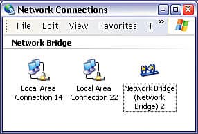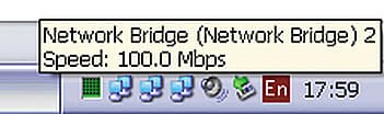 Как выяснилось, не меньшей схожестью (различия, в основном, в фирменных наименованиях и внутренних обозначениях версий драйверов) отличились и комплекты ПО, поставляемые с устройствами. Процесс инсталляции USB-устройств и под Windows 2000, и под Windows XP проходил без особых проблем. Они обнаруживались Windows как Safely Remove Hardware, с компакт-диска также инсталлировалась конфигурационная утилита, после чего в зависимости от поставленных задач можно было приступать к формированию сетевого подключения. Нами была выбрана конфигурация, когда все сетевые настройки осуществлялись в организованном силами операционной системы Network Bridge между уже имеющейся подключенной к корпоративной локальной сети FastEthernet-картой и подсетью машин, связанных PowerLine USB-адаптерами (рис. 7).