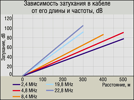 Рассмотрим поподробнее. Нас будет интересовать в дальнейшем полоса частот в несколько десятков мегагерц, ее минимальное значение определяется той информационной полосой, которую необходимо обеспечить, в нашем случае до десятка Mbps. Итак, в сетевом кабеле с ростом частоты (как, впрочем, и в любом другом фидере) растет значение погонного затухания (рис. 4).