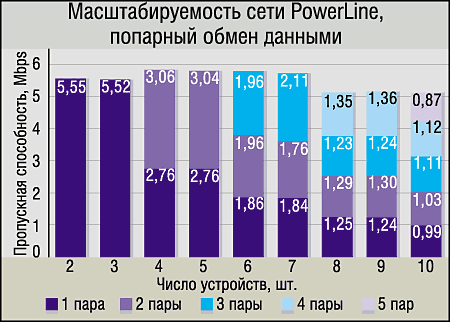Далее было интересно увидеть, как падает скорость работы устройств PowerLine в зависимости от их числа. Первое, на что обратили внимание, адаптеры умеют «молчать» и не мешать работе собратьев, когда их «не спрашивают». Достаточно было некоторое время не обращаться к конкретному устройству или просто отсоединить его от сетевой карты ПК и оно фактически переставало влиять на размер остаточной полосы пропускания. Результаты снижения скорости в зависимости от роста числа одновременно работающих устройств приведены на рис. 10.