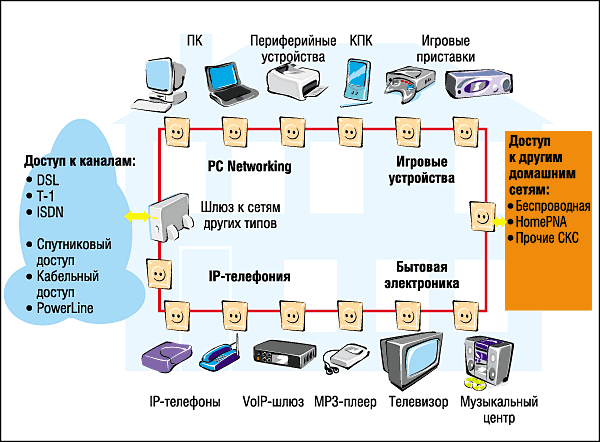 Ясно, что такая единая среда, включающая и ПК, и компьютерную периферию, и бытовые устройства, сможет функционировать только при наличии локальной информационной сети, основное требование к которой высокий и гарантированный уровень надежности, обусловливаемый, в первую очередь, степенью совершенства используемой технологии обмена данными. Очевидно и то, что появление интерфейсных гнезд для подключения USB, FireWire либо Ethernet на чайнике, пылесосе или светильнике-бра вряд ли будет воспринято покупателем с радостью. Хотя не будем зарекаться наверняка найдется производитель, который умудрится не только интегрировать все это в свою кофеварку, но и убедить клиента в том, что тот мечтал об этом всю свою жизнь.