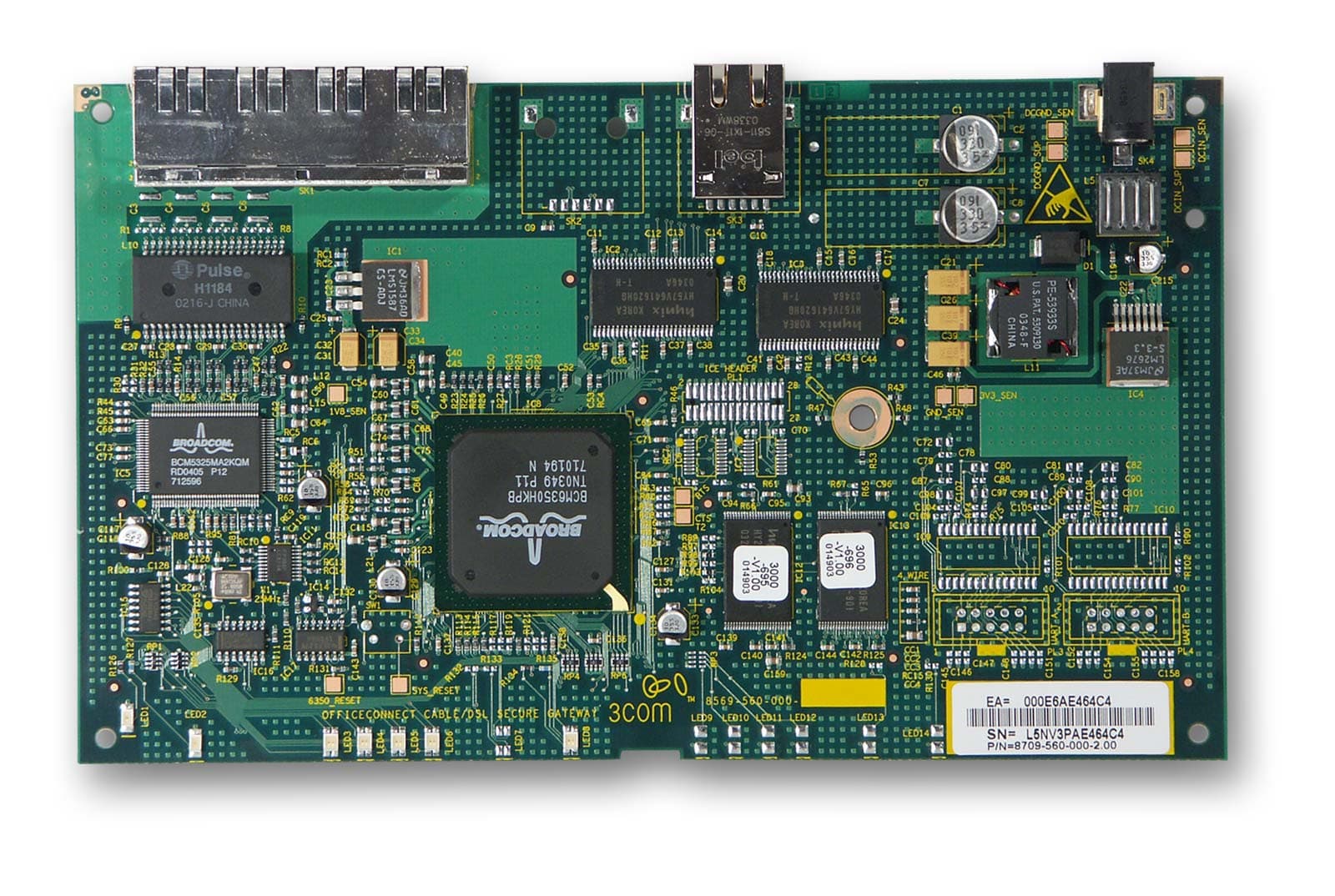 Другими словами говоря, визуально, отличий мне обнаружить не удалось. Слева фото 3CR860-95, справа – 3CR870-95. Вероятнее всего, устройства отличаются лишь прошивкой. А надпись снизу платы «OfficeConnect Cable Secure/DSL Gateway» напомнила мне одноименное устройство, которое было рассмотрено в этой статье. Схемотехника с тех пор значительных изменений не претерпела. По крайней мере, микроконтроллер и чип встроенного коммутатора Broadcom остались прежними.