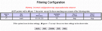 Встроенный файрвол обладает двумя особенностями. Во-первых, роутере два разных файрвола. Первый из них малофункционален и абсолютно не гибок. Он позволяет фильтровать только по исходящим из локальной сети IP адресам и по портам назначения, не поддерживает разделения пакетов по протоколам. Да в общем то, кроме вышенаписанного и привязки действия правил ко времени, он больше ничего не умеет.