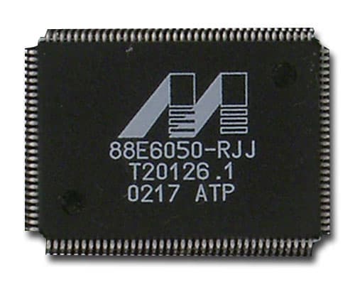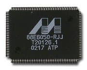 В качестве интегрированного коммутатора используется микроконтроллер Marvell 88E6050. Это пятипортовый 10/100 Мбит коммутатор с автоопределением полярности на каждом порту. Контроллер обладает 1 Мбит (256 Кбайт) буферной памяти и памятью для 1К MAC адресов. То есть довольно стандартный коммутатор. Четыре его порта используются под Ethernet интерфейсы локальной сети, а последний, вероятно, для соединения с интерфейсом беспроводной сети.