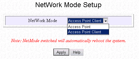 При подключении беспроводной карты, в меню появляется еще один пункт, касающийся режима работы беспроводной сети. Роутер может работать как в качестве клиента, так и в качестве точки доступа. Кроме того, хотя возможно дело было в отсутствии клиентов в беспроводном сегменте, но я не нашел в меню не раздела по выставлению WEP шифрования, не возможности задания псевдо-VLAN.