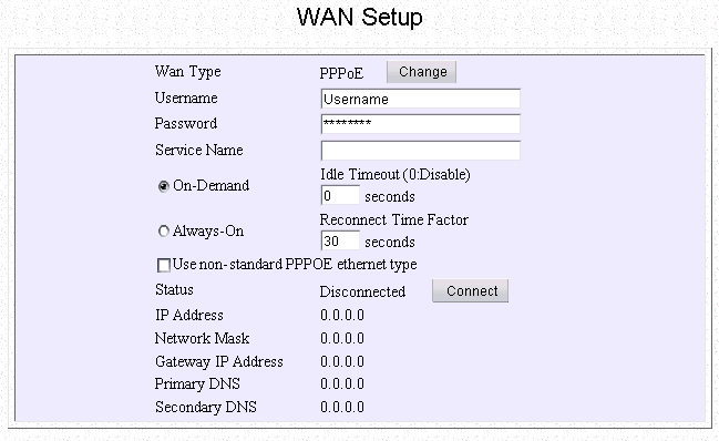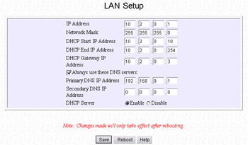 В верхних меню устанавливаются адреса и типы LAN и WAN интерфейсов, DNS сервера, шлюза по умолчанию и настройки встроенного DHCP сервера. WAN интерфейс может быть установлен в один из следующих типов