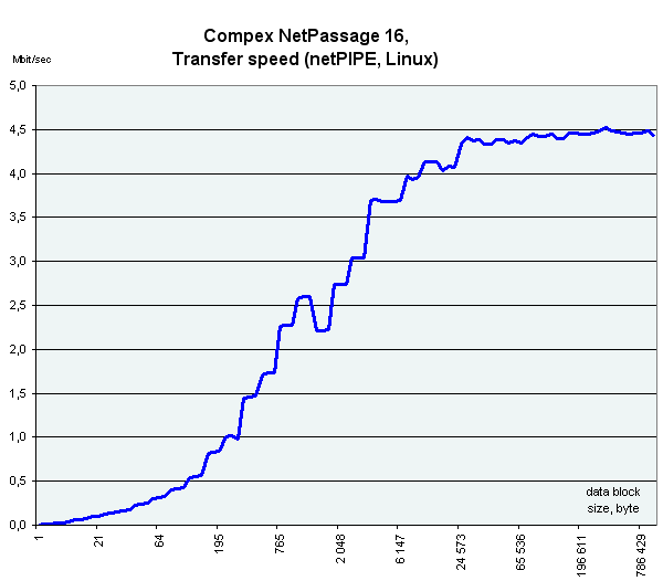 Программа генерирует трафик методом «Ping Pong». Поэтому скорость передачи данных будет одинакова вне зависимости от того, с какой стороны находится клиент netPIPE, а с какой сервер. Максимальная пиковая скорость передачи 4,14 Мбит/сек