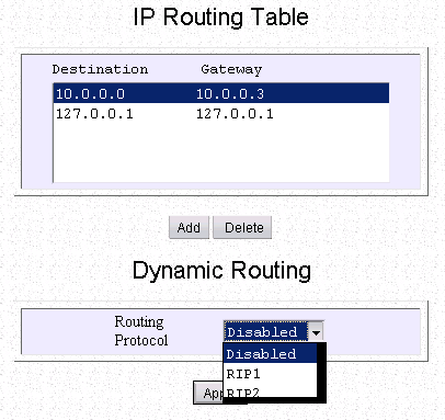 Еще одной интересной возможностью является статическая трансляция адресов из внутренний сети без их изменения. Опция по умолчанию отключена и может потребоваться, если пользователь имеет ноутбук с реальным IP адресом, из группы адресов, выданных провайдером и он не хочет переконфигурировать его для работы через роутер. Механизм статической трансляции адресов на роутере позволит получить доступ в Интернет с ноутбука без изменения IP адреса последнего.Меню роутинга позволяет задать дополнительные маршруты, а так же активировать протоколы RIP динамического роутинга.