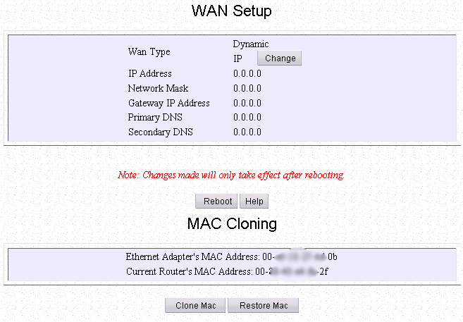 Интересным способом задается MAC адрес на WAN интерфейсе. Вручную его невозможно прописать не только в WEB интерфейсе, но и в консоли. Для его изменения следует сменить тип WAN интерфейса на динамический IP, тогда внизу появится еще одна менюшка, позволяющая сдублировать MAC адрес сетевого адаптера компьютера, с которого вы подключились к роутеру. Это конечно удобно, но не всегда.