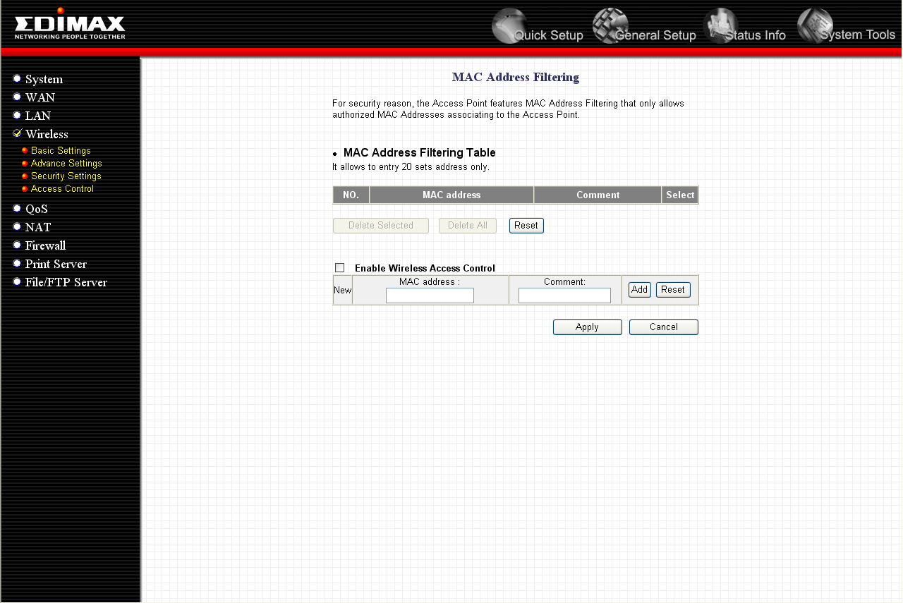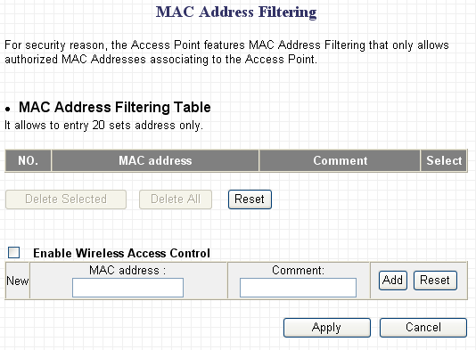 В устройстве предусмотрена фильтрация пользователей беспроводной сети по MAC-адресам, возможно задание до 20 записей.