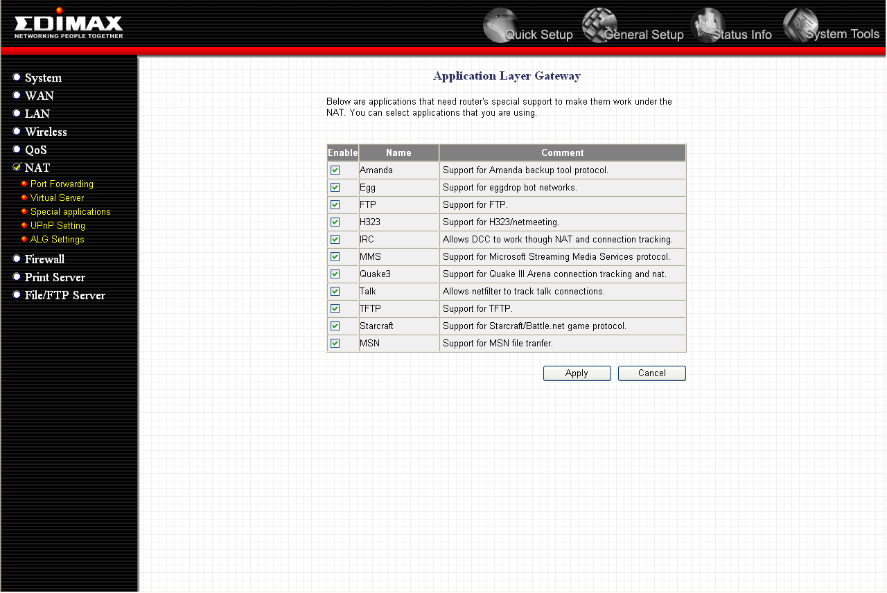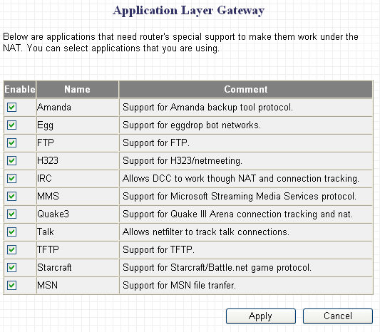 Устройство поддерживает ряд специальных приложений, с которыми возникают проблемы при работе через NAT.