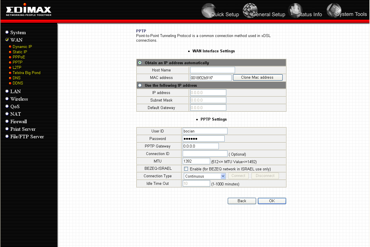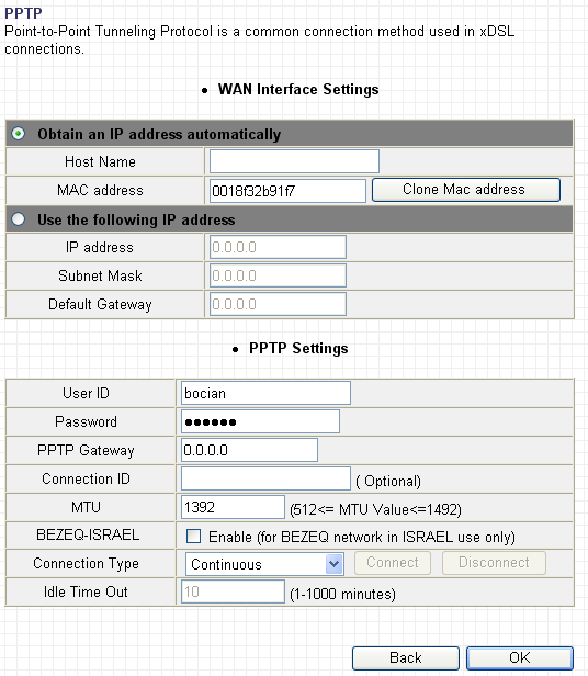 При использовании PPTP-подключения, возможно ручное задание IP-адреса WAN-интерфейса или же получение IP-адреса от DHCP-сервера. Следует учесть, что если в WAN-сегменте сети задан шлюз по умолчанию — устройство будет всегда пытаться подключиться к PPTP-серверу через этот шлюз… даже если сам PPTP-сервер находится в том же сегменте сети, что и WAN-интерфейс — об этой особенности мы уже говорили выше. Также после подключения к PPTP-серверу, доступ к WAN-сегменту сети теряется — типичный недостаток многих подобных устройств.