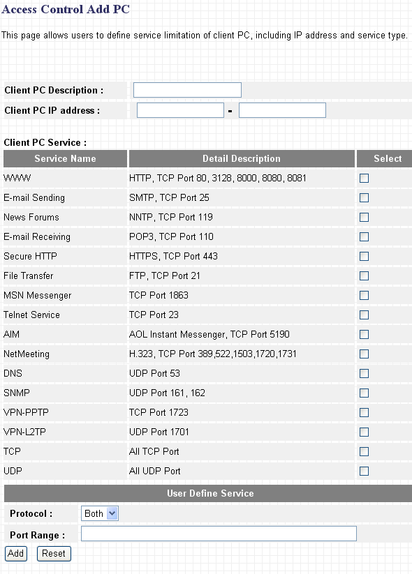 Настройки файрвола позволяют задать до 20 комплексных правил. Каждое правило позволяет задать диапазон IP-адресов в LAN-сегменте маршрутизатора, к которым применяется данное правило, и диапазон портов назначения (для TCP и UDP протоколов), которые будут блокироваться. При использовании файрвола возможны некоторые затруднения, связанные с тем, что в настройках не предусмотрено задание статических записей DHCP-сервера и статических записей в ARP-таблице.
