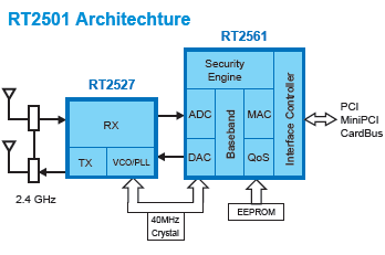 Беспроводная часть устройства размещена на отдельной mini-PCI плате и базируется на чипсете Ralink RT2561ST (интерфейс Cardbus/PCI/mini-PCI, поддержка технологии packet-OVERDRIVE, поддержка IEEE 802.11 a/b/g, поддержка WEP 64/128, WPA, WPA2, 802.1x, поддержка ОС Windows, MacOS и Linux — данный чипсет идет как компонент архитектуры Ralink RT2501 схема применения приведена ниже), остальные компоненты скрыты под экраном, закрепленном на самой плате.