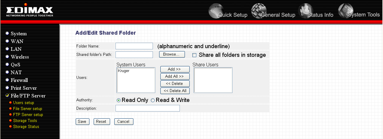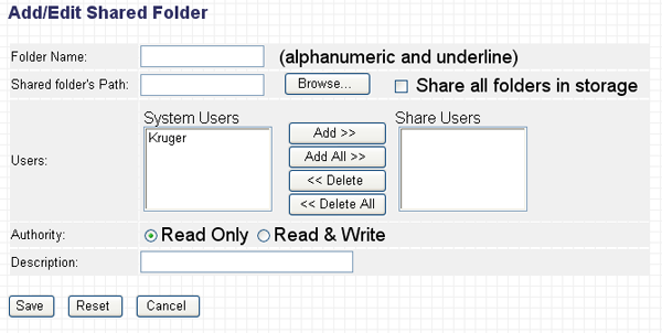 Здесь реализован интерфейс добавления новых пользователей. Имена/пароли пользователей, добавленных через данный интерфейс, можно будет использовать для доступа к хранилищу файлов по SMB и FTP протоколам. Хотим отметить, что устройство не предоставляет возможности неавторизованного доступа к хранилищу — возможен только доступ с использованием логинов и паролей, которые как раз и задаются с использованием настроек, представленных на скриншоте выше.