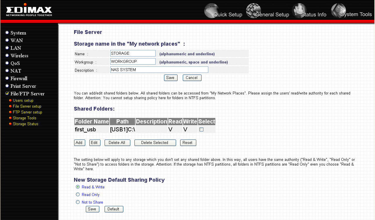 На устройстве расположены два порта USB 2.0, позволяющие подключать внешние накопители данных и USB-принтеры. USB-принтеров, к сожалению, в нашем арсенале не оказалось, зато оказался Flash-накопитель, с которым мы и попробуем поработать. Для начала посмотрим на интерфейс настройки Flash-накопителей…