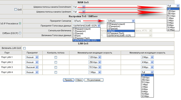 Теперь посмотрим на задание приоритета трафику. Возможно задание приоритетов LOW и HIGH (низкого и высокого соответственно). Судя по результатам тестов, приоритеты назначаются трафику, идущему в направлении LAN -> WAN. Назначение приоритетов трафику, идущему между LAN-портами, а также в направлении WAN -> LAN не влияет на распределение потоков трафика.
