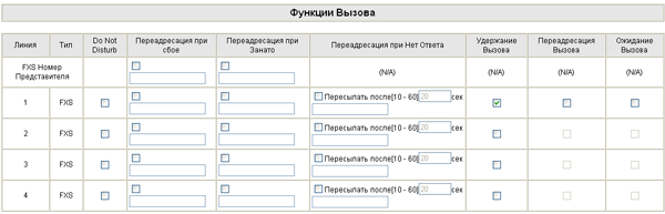 Для каждого подключенного телефона возможно также задание Hot Line номера — номера, который будет набран после снятия трубки. Можно также задать задержку — то есть через сколько секунд после снятия трубки будет набран Hot Line номер, если абонент не набрал номер телефона самостоятельно (это что-то наподобие связи с оператором). Также возможно запретить или разрешить использование факса.