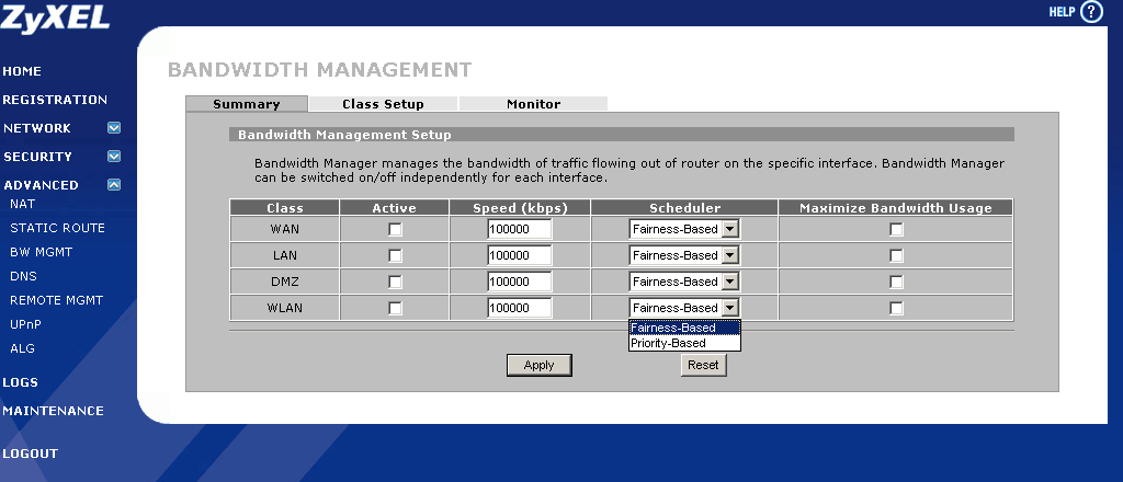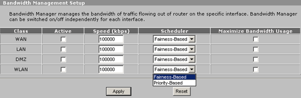 Возможности управления полосой пропускания позволяют задавать скорость трафика, исходящего с интерфейсов LAN, WAN, WLAN и DMZ. Для каждого интерфейса настройки задаются отдельно.