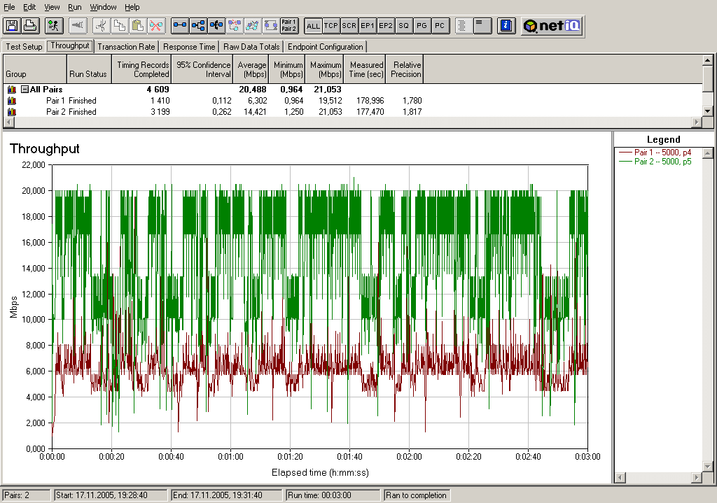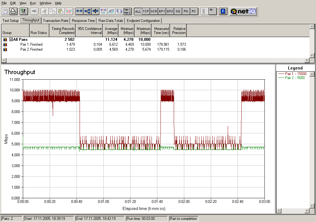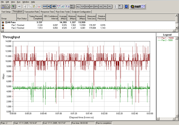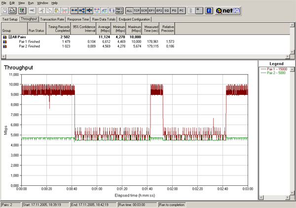 Теперь создадим два потока и используем два подкласса. Корневой класс: 20000 Мбит/с. Первый подкласс — 15000 кбит/с, второй — 5000 кбит/с. Посмотрим, как распределяется трафик между потоками.
