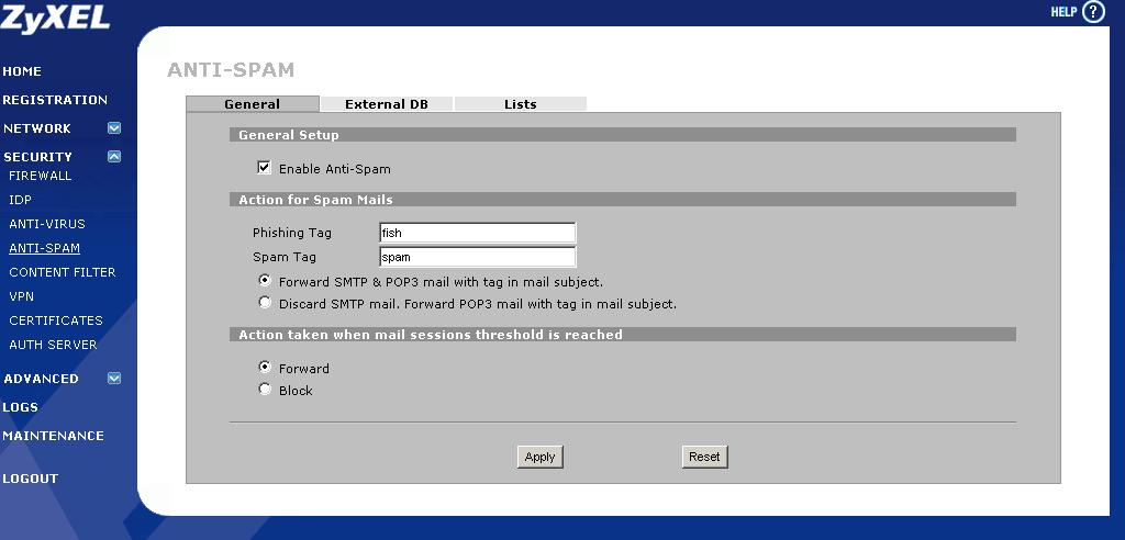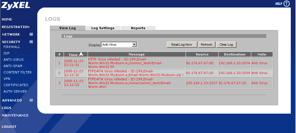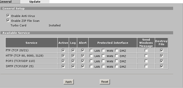 Антивирусная защита реализуется в устройстве при помощи карты расширения ZyWALL Turbo Card. Осуществляется проверка трафика, идущего по протоколам HTTP, POP3, SMTP и FTP. При этом указываются интерфейсы, трафик, исходящий с которых подвергается проверке. Используемый в карточке ZyWALL Turbo Card алгоритм позволяет проводить антивирусную проверку файлов вне зависимости от их размера и, не оказывая сильного замедления трафика. Напомню, что, так как используемые тесты "гоняют" случайный трафик, не используя для этого протоколы высоких уровней (таких как HTTP, FTP и др.), поэтому насколько в действительности проверка трафика на вирусы влияет на скорость трафика, с помощью объективных тестов выяснить не удалось.