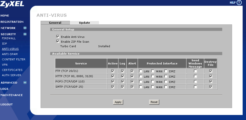 Enable Anti-Virus — включает антивирусную защиту устройства (ZyWALL Turbo Card должна быть установлена)