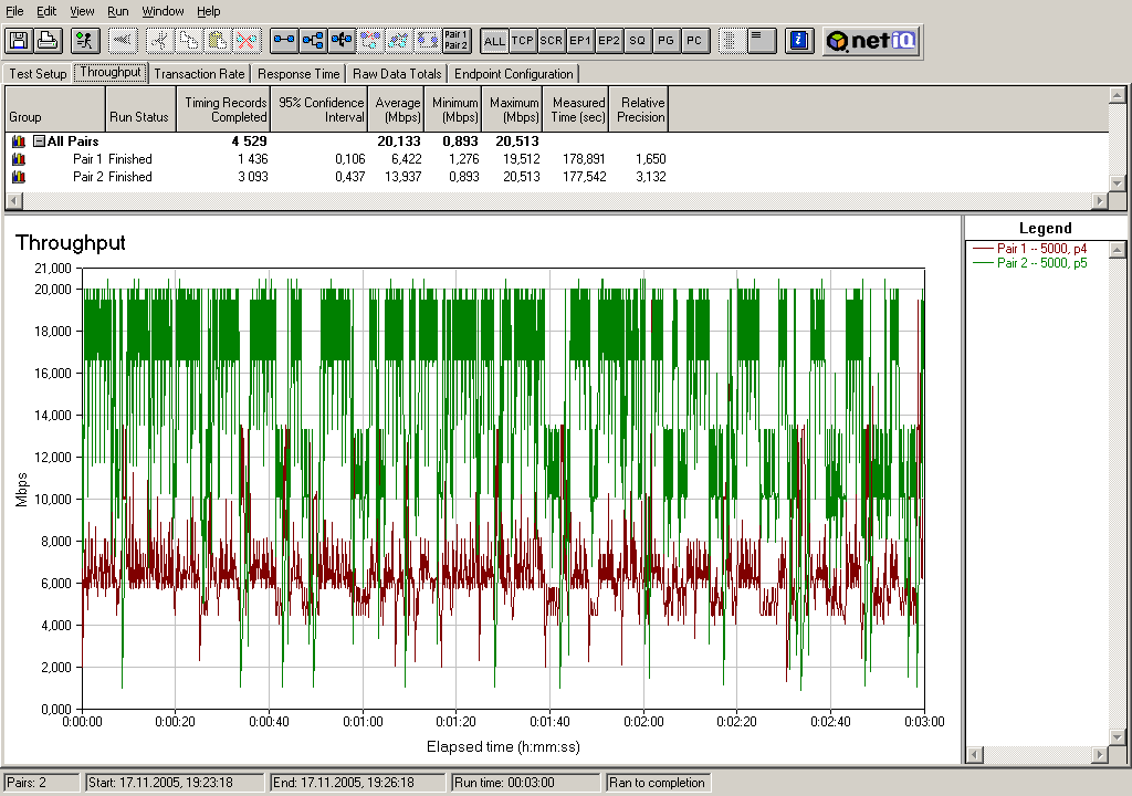 На графике явно прослеживаются результаты работы "шейпинга" трафика, но распределение скоростей между потоками не соответствует соотношению 3/1 (три к одному). Суммарная средняя скорость: 14,393 Мбит/с до 20000 кбит/с тоже явно не дотягивает. Скорость распределяется между потоками в соотношении примерно 2/1.