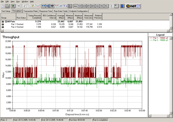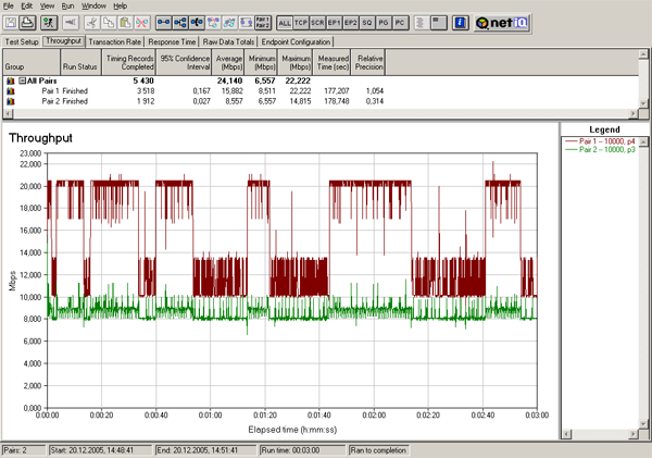Поток, скорость которого в параметрах шейпинга была установлена в 10000 кбит/с, работал как раз на заданной скорости, а поток, скорость которого была установлена в 30000 кбит/с, — показывал значительно более низкую скорость (около 16 Мбит/с) и при этом график скорости сильно варьировался. Уже по первому графику видно, что шейпинг трафика работает, но также видно, что результаты его работы сильно отличаются от заданных в параметрах устройства.