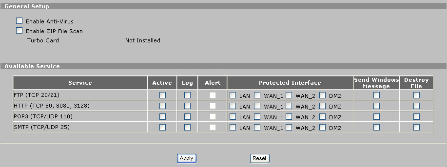 Enable Anti-Virus — включает антивирусную защиту устройства (ZyWALL Turbo Card должна быть установлена)