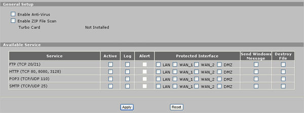 Антивирусная защита реализуется в устройстве при помощи карты расширения ZyWALL Turbo Card. Осуществляется проверка трафика, идущего по протоколам HTTP, POP3, SMTP и FTP. При этом указываются интерфейсы, трафик, исходящий с которых, подвергается проверке. Используемый в карточке ZyWALL Turbo Card алгоритм позволяет проводить антивирусную проверку файлов вне зависимости от их размера и, не сказываясь значительного на скорости трафика. Напомню, что, так как используемые тесты "гоняют" случайный трафик, не используя для этого протоколы высоких уровней (таких как HTTP, FTP и др.), поэтому насколько в действительности проверка трафика на вирусы влияет на скорость трафика, с помощью объективных тестов выяснить не удалось.
