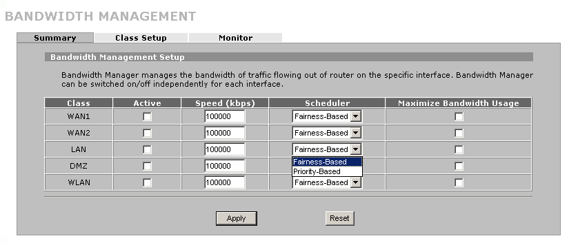 В колонке "Scheduler" устанавливается, каким образом трафик разделяется между подклассами. При выборе типа "Priority-Based" трафик распределяется между классами в соответствии с приоритетами, установленными на каждом классе. При выборе пункта "Fairness-Based" роутер распределяет трафик равномерно между классами — это предотвращает использование всей полосы пропускания одним классом.