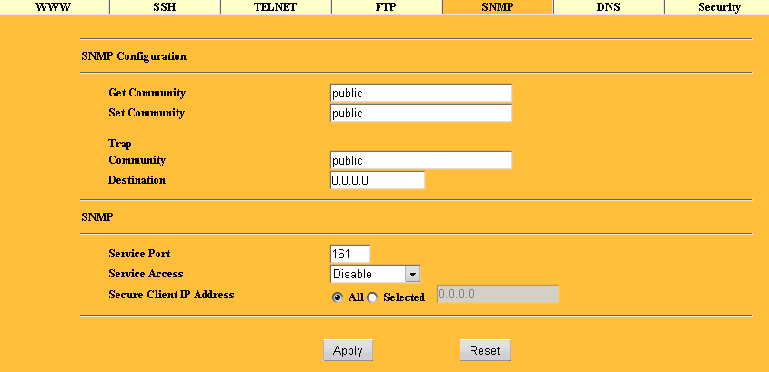 В этом же разделе производится настройка SNMP (пароли, привязка к портам и интерфейсам) и DNS (привязка к интерфейсам) сервисов.